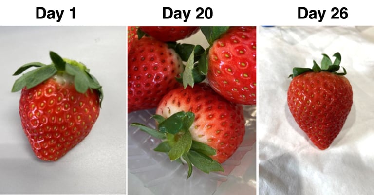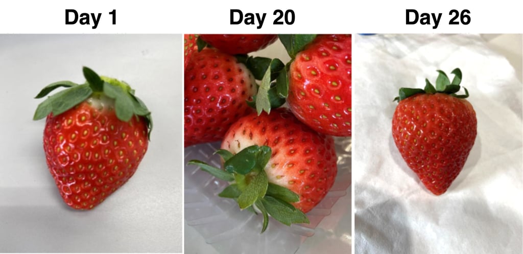 日本栃木県の名産であるとちおとめ。Cool Innovationの技術で26日目に外見、味、食感の検査を行いましたが、3つの指標はすべて1日目と変わりなく、2ヶ月後でも、3つの指標もほぼ変わりがない結果を確認しました。