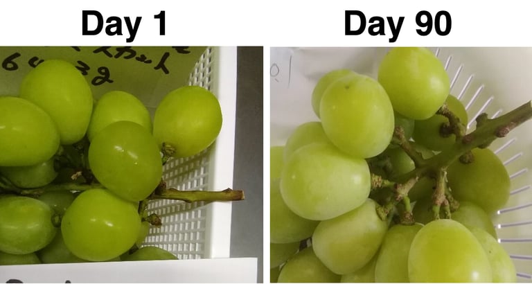 日本ではプレミアムなブドウ。Cool Innovationの技術で90日間保存した後、外見や食感に関する変化は微々たるものでした。パッケージが一切ない状態で保存しましたが、適した包装を施した際は、より良い鮮度維持が期待できます。