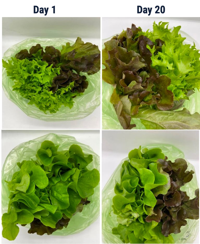 富士山の麓にて生産されているグリーンレタス。Cool Innovationの技術で20日目に外見のテストと検査を行いました。スーパーに陳列しても、真っ先に購入される新鮮さを保ちました。最長45日まで鮮度維持可能だと確認出来ました。