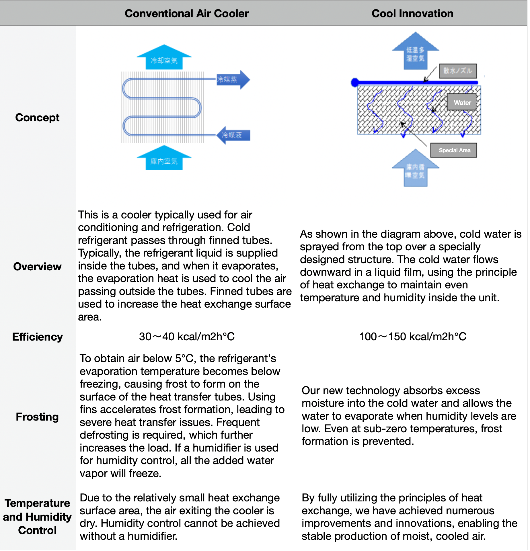 We offer a range of products, including small experimental refrigerators, land/sea containers, and cooling units for large refrigerated warehouses. There are no size restrictions for warehouses, and by adding our cooling units according to the volume, you can extend the freshness preservation period of fresh produce by more than 10 times*, reduce energy consumption by 50%, and create a storage space that allows for free opening, closing, and mixed storage.