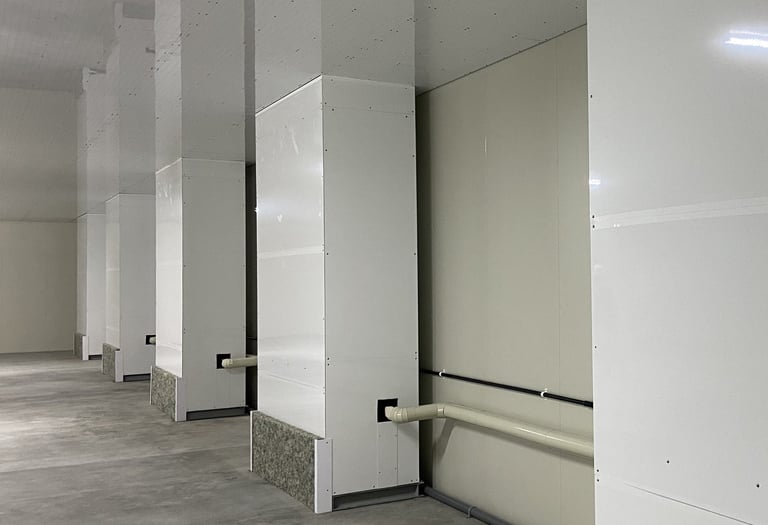 製品は小型の実験用冷蔵庫、陸上/海上コンテナ、大型冷蔵倉庫向け冷却ユニットを用意しております。倉庫に対する大きさの制限がなく、体積に合わせて弊社冷却ユニットを増やす事で、生鮮品の鮮度維持期間を10倍以上(鮮度維持期間は生鮮品によって異なります)、エネルギー消費50%、自由に開け閉めや混載が出来る保存空間を作り出せます。